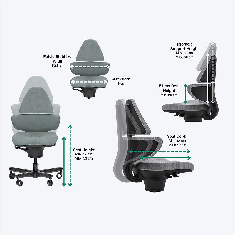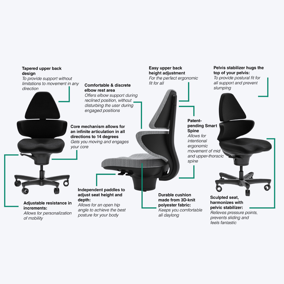 Seat and Back harmonize to stabilize the pelvis to optimize balance and alignment of your spine for ideal sitting posture.